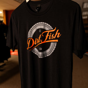 Tire design in grey with our orange DirtFish logo in a new font on a soft, black tee shirt.